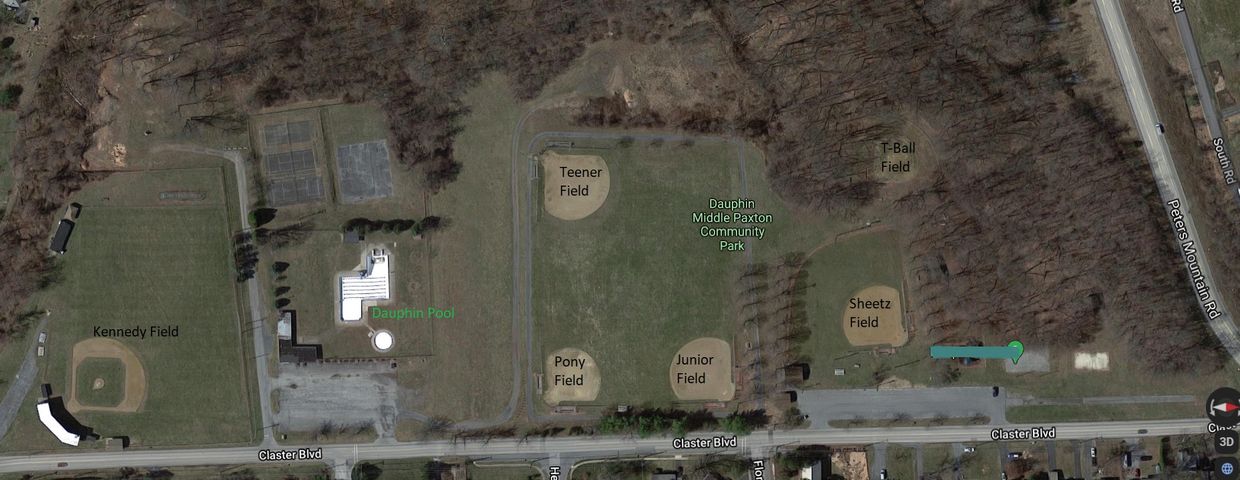 The picture above shows all of the field locations. Visitors should park in the lot along Claster Boulevard adjacent to Sheetz Field.